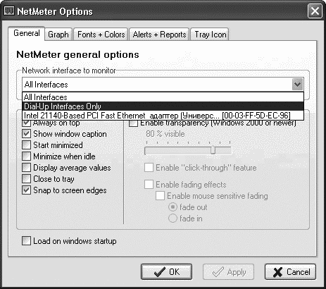 Программа позволяет настраивать интерфейс. Можно выбрать из списка вариант All interfaces – отображение и телефонных, и кабельных соединений. Вариант Dial-Up Interfaces Only означает подсчет трафика коммутируемого соединения (рис. 1.20).