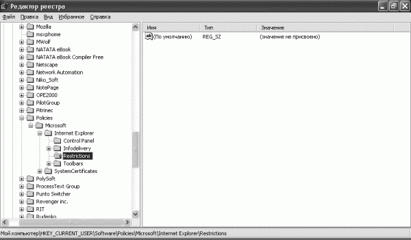 В Windows есть возможность запретить (или разрешить) доступ к свойствам обозревателя Internet Explorer (Сервис→Свойства обозревателя). Для этого в разделе HKEY_CURRENT_USER\Software\Policies\Microsoft\Internet Explorer\ Restrictions нужно создать строковый параметр NoBrowserOptions со значением 1. Затем откройте раздел реестра HKEY_CURRENT_USER\Software\ Policies\Microsoft\Internet Explorer\Control Panel (рис. 2.2). Если такого раздела не существует, то создайте его. В разделе можно ввести переменные, которые позволят заблокировать доступ к некоторым настройкам Internet Explorer.