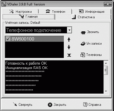 VDialer (http://v-programs.narod.ru) – не просто программа для дозвона. В ее функции входит много других сервисных возможностей, так или иначе предназначенных для работы в Интернете при доступе по коммутируемому каналу. После установки VDialer импортирует все созданные ранее удаленные соединения.
