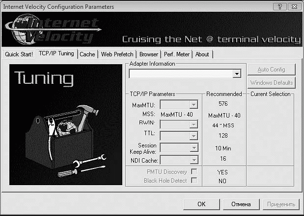 Настраивать интернет-соединения нужно на вкладке TCP/IP Tuning. Выбрав устройство (модем или сетевую карту), можно задать значения полей MaxMTU, RWIN, TTL и др. (рис. 1.4).
