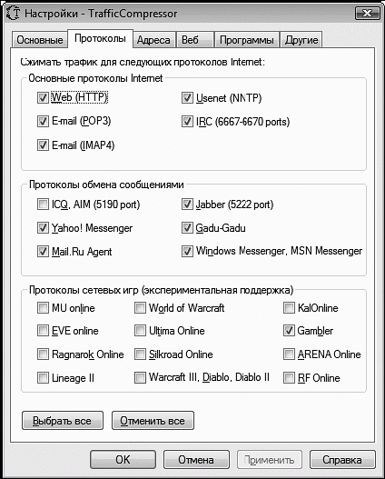 Выбрав пункт меню Настройки, на вкладке Протоколы в соответствующих областях можно указать, для каких протоколов следует сжимать трафик (рис. 1.5).