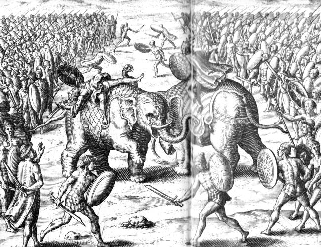 Слонов начали использовать в военном деле в Древней Индии в первой половине I тыс. до н. э. Армия Александра Македонского (356–323 гг. до н. э.) познакомилась с боевыми слонами во время кампании при Гавгамелах (331 г. до н. э.) против персидского войска царя Дария III (336–330 гг. до н. э.), когда индийцы привели в царскую армию 15 животных. Хотя слоны и числились в персидской диспозиции перед царским отрядом, реально они в бою не участвовали, а после боя их захватили в персидском лагере. Куда слоны потом делись, неясно, возможно, их оставили в Вавилоне. Позднее, в 327 г. до н. э., в начале индийского похода, Александр стал получать слонов в дар от индийских раджей. И лишь в сражении с царем Пором при Гидаспе в 326 г. до н. э. македоняне впервые столкнулись со слонами на поле битвы. Со времени индийского похода слоны вместе с индийскими вожаками-корнаками вошли в армию Александра Македонского, находясь в обозе, поскольку крупномасштабные битвы тогда не велись.