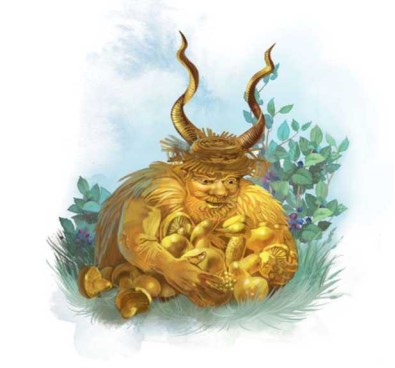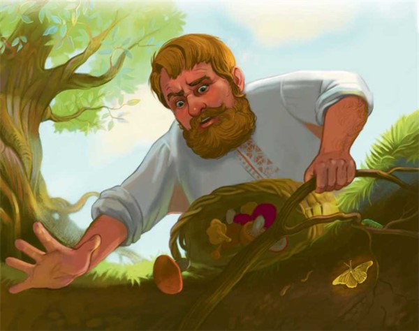 Глядь, а недалеко от корзины, под корнями дерева, яма вырыта. Да большая какая, целый бык может в ней поместиться! Кто же ее вырыл? Любопытно стало мельнику, решил он в яму заглянуть, нагнулся да по неосторожности задел свою корзину. Грибы раз – и в яму покатились. Всего-то несколько грибков упало, да Евстигней такой жадный был, что и за одним бы полез.