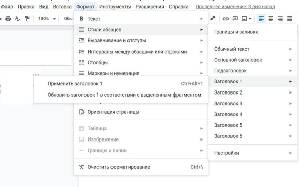 Главный заголовок (название статьи) выделяем стилем Заголовок 1. В Google Docs это меню «Формат», «Стили абзацев», «Заголовок 1», далее «Применить заголовок 1». В Ворде новых версий кнопка «Заголовок 1» находится прямо на рабочей панели справа. В Ворде старых версий «Формат», «Стили и форматирование», «Заголовок 1». ВАЖНО! В тексте может быть лишь ОДИН заголовок первого уровня.