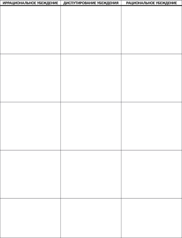 Выберите пять актуальных для вас иррациональных убеждений и продиспутируйте каждое, опираясь на нижеприведённые вопросы. Для каждого иррационального убеждения сформулируйте новое – более рациональное, реалистичное, гибкое и помогающее, на которое вы теперь будете опираться в повседневной жизни.