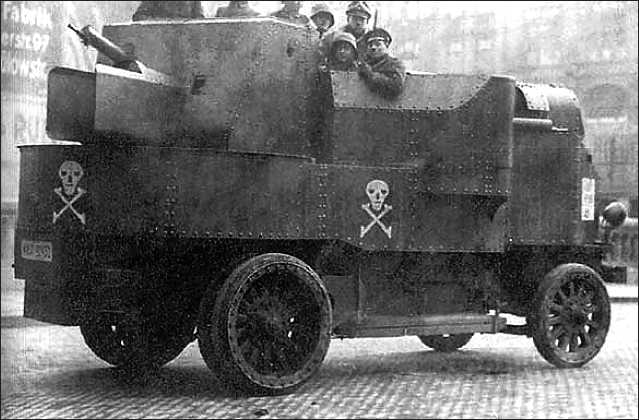 Несколько слов о вооружении германских белых добровольцев. С учетом того, что им приходилось вести боевые действия по преимуществу в городских условиях, вооружение фрейкоровцев ограничивалось в основном стрелковым оружием – винтовками, карабинами, пистолетами и револьверами, тяжелыми и легкими пулеметами, минометами и огнеметами. Кроме того, у них имелось некоторое количество пистолетов-пулеметов «Бергман» МР-18. В боях на улицах германских городов, где фактически решалась судьба мировой революции, «о необходимости которой так долго говорили большевики», но которая, к счастью, не совершилась, активно использовались как ручные гранаты-«бутылки», так и гранаты-«лимонки», саперные лопатки и «окопные кинжалы» – «узкие, шилообразные, похожие скорее на средневековые итальянские стилеты, и такие острые, что, вонзенные в рукопашной схватке в глаз противника, мгновенно ударялись изнутри о черепную кость врага» (как писал Людвиг Ренн в своей дилогии «Война»/«После войны»).