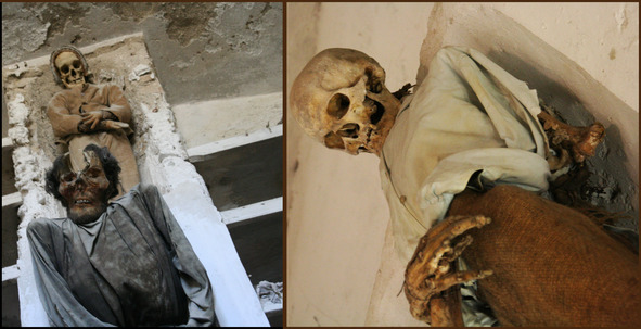 И они одеты, эти мертвецы, эти бедные, безобразные и смешные мертвецы, одеты своими родными, которые вытащили их из гробов, чтобы поместить в это страшное собрание. Почти все они облачены в какие-то черные одежды; у некоторых накинуты на голову капюшоны. Впрочем, есть и такие, которых захотели одеть более роскошно – и жалкий скелет с расшитой греческой феской на голове, в халате богатого рантье, лежит на спине, страшный и комичный, словно погруженный в жуткий сон…». Так в 1890 году в «Бродячей жизни» Мопассан описал это царство смерти. Длинные ряды одетых по рангу, полу и положению в обществе тел от бурого до красноватого оттенков, стоят и лежат в галереях вдоль коридоров или висят в нишах в стене, зацепленные крюками вокруг шеи. Кажется, что с наступлением ночи, поглощающей свет и бесчисленные взгляды туристов, мертвецы разыгрывают спектакль жизни, театр теней, которым на самом деле управляла борьба сил, происходящая на другой более низкой сцене (экономический процесс, открывший катакомбы монахов для знатных граждан, конфликт бессознательных желаний и т. д.).
