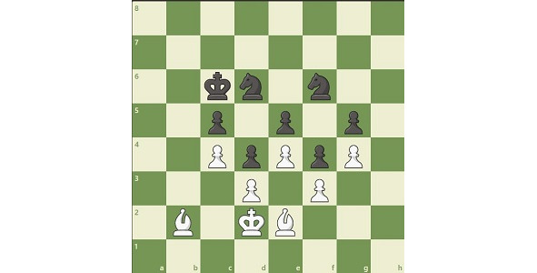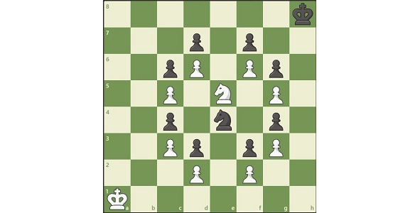 Из представленной выше схемы видно, что белые слона на полях b2, и e2, «зажаты» как вражескими, так и своими пешками. Для них нет открытых диагоналей. Весь центр шахматной доски представляет из себя большую «пробку». В данной случае, можно сказать, что все-таки конь будет посильнее слона. Или следующая позиция.