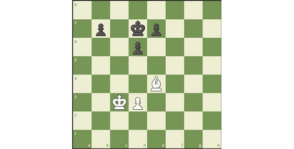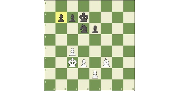 Из выше представленной схемы видно, что слон занимает весьма активную позицию, и практически ограничивает все движение пешек соперника. На доске у белых находится слон с пешкой, то есть 4 пешки, а у черных – ввэсего 3. Кроме этого, белые своим первым ходом забирают слоном вражескую пешку на b7. Таким образом, перевес составил 2 пешки. Черные обречены, однако при грамотной игре, можно свести партию на ничью.