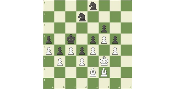 Ситуация аналогична. Практически без вариантов. Белым остается либо предлагать ничью, либо уходить в защиту, либо идти на крайние меры. К последним можно отнести, например, жертву слона на поле f2. Ход белых Сf2-h4 может дать некоторое развитие этой большой и длинной стене пешек. Со стороны черных, развитие партии может получить продолжение путем жертвы коня, например на поле а4. Главное, выбрать момент. И скореe всего прорыв будет там, где ближе всего находится король. Следующая схема.