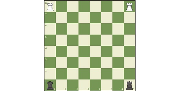 Далее рассмотрим такую фигуру как ладья. Первоначальное положение ладьи на шахматной доске представлено на схеме ниже.