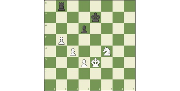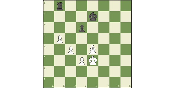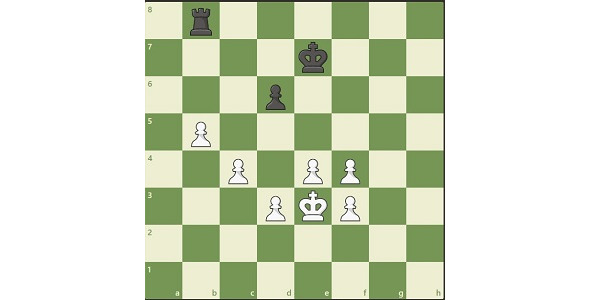 Из вышепредставленной схемы видно, что на доске 6 чёрных пешек, против ладьи, и всего 1 пешки. В данной ситуации, белые пешки находятся очень близко друг к другу, поддерживая одна другую. Лучшая стратегия белых: постепенное наступление сразу всеми пешками в поддержке с королем. Черные в данном эндшпиль, скорее всего, обречены. Увы. Другое дело, если бы пешки находились пофлангово. Лучшее решение для черных: заходить с тыла ладьей, и сдерживать атаку королем. Посмотрим на следующую схему.