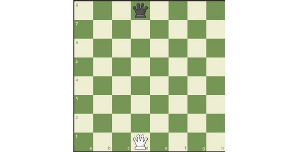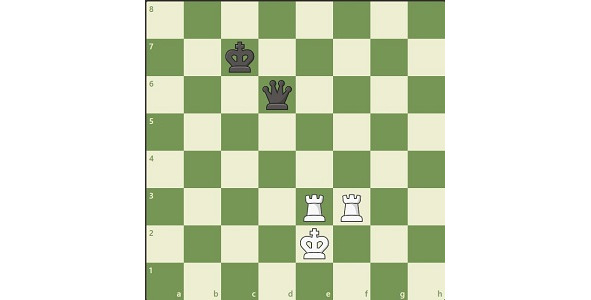 Из представленной схемы ладья + ладья видно, что на доске ничья. При правильной игре, у противников одинаковая позиция. Как указывалось уже ранее, сдвоенная ладья, обладает огромным потенциалом, который может противостоять даже ферзю. И пока эти фигуры будут оставаться в паре, ферзь ничего не сможет сделать. Напротив, из выше представленной схемы видно, что при любом неправильном ходе, белые рискуют потерять своего ферзя, и если это произойдёт, то черные останутся с ладьей, а это значит, что победа за последними. Но об этом в разделе эндшпиля. Следующая схема.