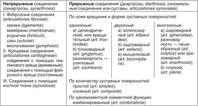 Имеющиеся в теле человека многочисленные соединения костей целесообразно представить в виде классификации (табл. 1.1). В соответствии с данной классификацией существуют два основных вида соединений костей – непрерывное и прерывное, каждое из которых в свою очередь подразделяется на несколько групп (Гайворонский И. В., Ничипорук Г. И., 2005).