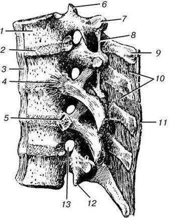 1 – тело позвонка; 2 – межпозвоночный диск; 3 – передняя продольная связка; 4 – лучистая связка головки ребра; 5 – сустав головки ребра; 6 – верхний суставной отросток; 8 – межпоперечная связка; 9 – остистый отросток; 10 – межостистые связки; 11 – надостистая связка; 12 – нижний суставной отросток; 13 – межпозвоночное отверстие.