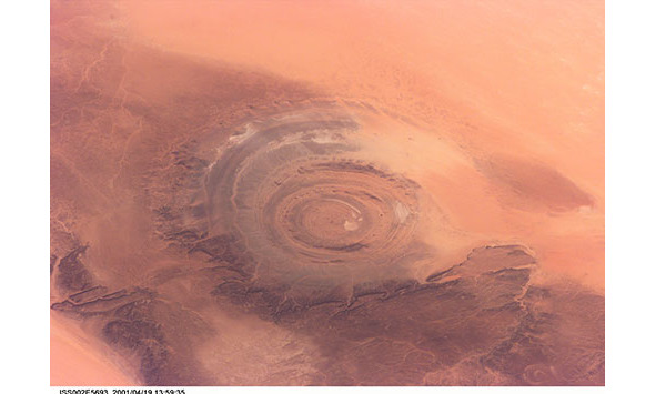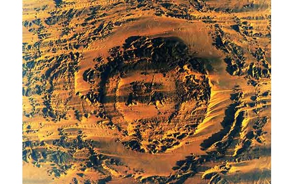 Метеоритный кратер Аорунга. Столкновение с кометой или астероидом 345 миллионов лет назад оставило на теле Земли шрамы кольцевых образований в Сахаре, на севере Чада. Вероятно, кольца образованы повторным ударом обломков метеорита. (iss034e070070)