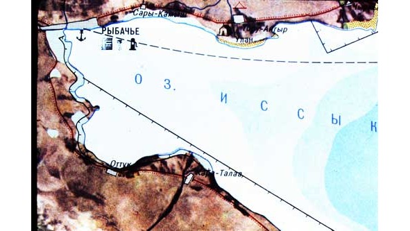 Фрагмент карты озера Иссык-Куль по космическим снимкам рисует точный контур озера.
