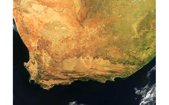 Из космоса видно одновременно и целиком всё то, что поколениям картографов приходилось составлять по кусочкам. Южная оконечность Африки – мыс Доброй Надежды, и самый южный африканский мыс – Игольный. (amo_2010102_lrg)