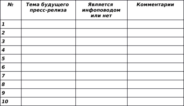 ПРАКТИКА: Выпишите темы ваших будущих пресс-релизов. Напротив, исходя из прочитанного в этой главе, определите, какая тема может послужить инфоповодом, а какая – нет.