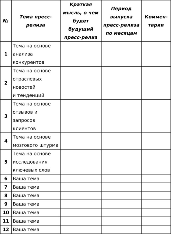 ПРАКТИКА: На основе тем, выбранных вами в практическом задании главы 2, а также тем, представленных в главе 3, составьте краткий годовой план выпуска пресс-релизов.