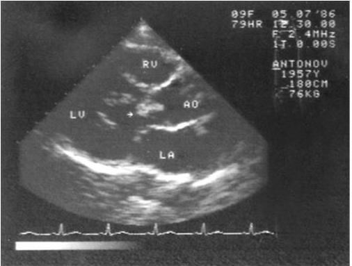 Рис. 1.7. Эхокардиограмма больного инфекционным эндокардитом. Вегетация (указана стрелкой) на аортальном клапане