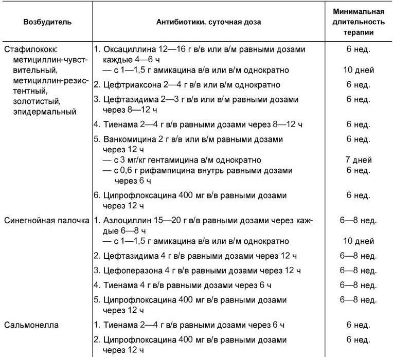 Длительность терапии определяется исчезновением клинико-лабораторных признаков воспаления, но она не должна быть короче четырех недель даже при самом благоприятном ответе на терапию. Как правило, снижение температурной реакции отмечается через 3 – 7 дней после начала терапии. Длительная антибактериальная терапия может осложняться различными побочными действиями, в том числе ухудшением функционального состояния почек. Нефротоксичность наиболее характерна для гентамицина.