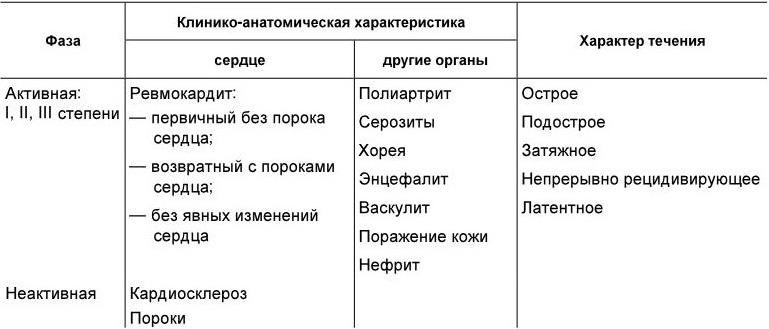 Классификация. В настоящее время нет общепринятой в мире классификации ревматизма. В нашей стране принята рабочая классификация ревматизма, в соответствии с которой выделяют активную и неактивную фазы ревматизма, оценивают остроту течения, наличие органных изменений и состояние кровообращения (табл. 1.14).