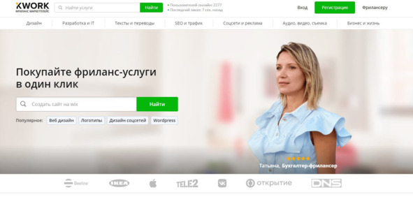 И еще один пример – KWORK – биржа, где представлены услуги дизайнеров, копирайтеров и т. п. Но глобально всех этих продавцов услуг объединяет фриланс.