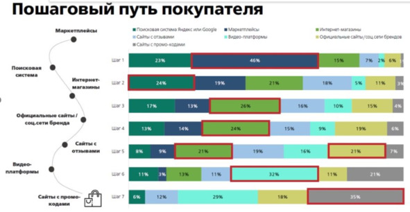 Маркетплейс ➡ Поисковая система ➡ Официальный сайт или соцсеть бренда ➡ Сайт с отзывами ➡ Видеоплатформа ➡ Сайты с промокодами.