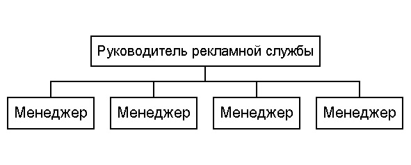Рекламная служба организовывается как четко выраженное подразделение с численностью сотрудников не менее 3-х человек, имеющая руководителя, подчиненного главному редактору (иногда генеральному директору). Иногда рекламная служба организовывается как отдельное юридическое лицо (называемое обычно рекламным агентством) с собственной бухгалтерской службой и численностью около 10 человек. Иногда рекламная служба представляет одного человека (руководителя), который окружает себя большим числом внештатных агентов, организуя или не организуя их работу. Здесь возможны различные вариации.