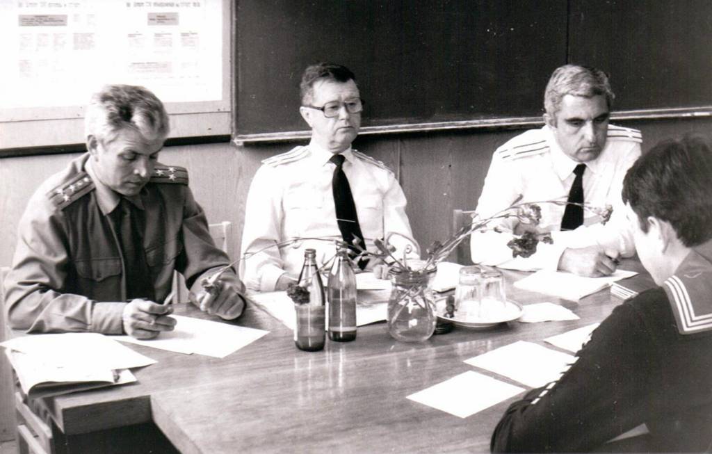 Фото 14. Комиссия принимает экзамен по ВМРГ. В центре – начальник кафедры полковник медицинской службы профессор Г.Н. Новожилов (1984).