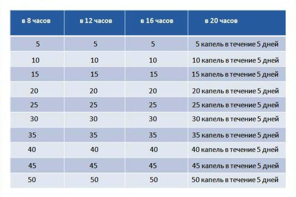 По этой методике, дозу в 5 капель больше не подымают до самого выздоровления. Наращивая число капель каждые 4 дня, следует заметить, на какой дозе почувствуете облегчение и дальше ориентироваться именно на это число капель. И вовсе не обязательно, что их должно быть 5. Спустя некоторое время можно попытаться довести дозу до 5 капель, но очень осторожно! Не допускать передозировки!