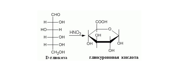 Более жесткое окисление до альдуроновых кислот, реакция происходит при участии «средних» окислителей, например небольшие концентрации азотной кислоты (Рисунок 12). Данная реакция происходит и в природе, но при других условиях. В результате окисляется гидроксильная группа при последнем атоме углерода.