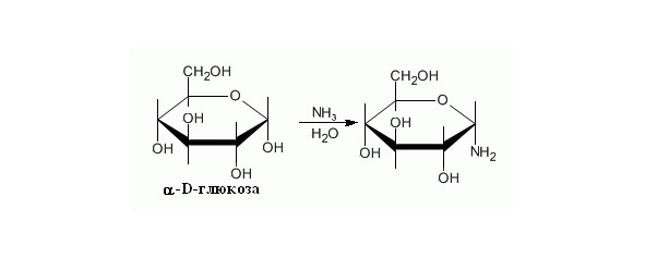 Образование аминосахаров. В природе также происходит синтез аминосахаров, но механизм и атакуемые группы отличаются, в искуственной системе в реакцию вступает полуацетальная группировка как наиболее реакционно способная (Рисунок 16).