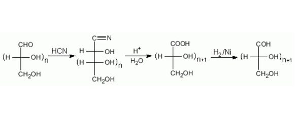 Удлинение цепи. Это результат реакции с цианидом, затем происходит реакция с водой, в результате образуется кислота. Восстановление карбоксильной группы приводит к образованию моносахарида, но на один атом углерода длиннее (Рисунок 18).