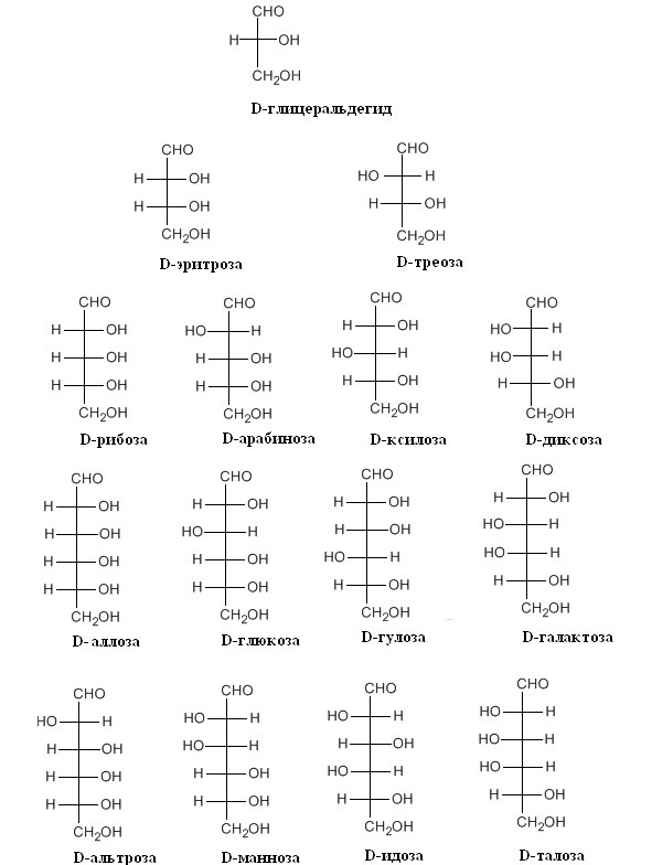 Рисунок 1. Структурные формулы стереоизомеров углеводов, * – отмечены асимметрические (хиральные) атомы. А – глицероальдегид * – отмечен асимметрический атом, определяющий принадлежность к D или L форме, Б – стереоизомеры глюкозы, крупной * отмечены асимметрические атомы углерода, определяющие принадлежность к стереоизомерам