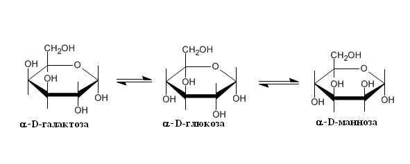 Перегруппировка в щелочной среде. В холодном разбавленном щелочном растворе глюкоза образует маннозу и фруктозу. Механизм реакции, возможно, включает енолизацию, которая сопровождается диссоциацией водорода от атома углерода, примыкающего к карбонильной группе. Так образуются эпимеры – глюкоза и манноза.
