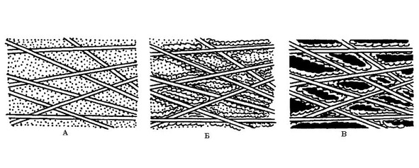 Рисунок 25. Инкрустация клеточной оболочки. А – фибриллярный каркас и межфибриллярный матрикс; Б – инкрустированная лигнином и утерявшая способность к растяжению оболочка с остатками матрикса; В – последующее инкрустирование фенолами и (или) минеральными веществами, приводящее к повышению твердости оболочки