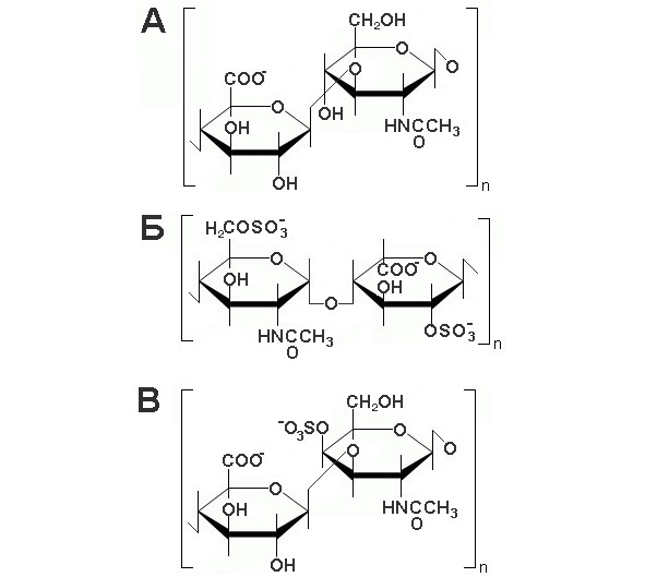Рисунок 29. Формулы структурных полисахаридов позвоночных. А-гиалуроновая кислота, Б-гепарин, В-хондроэтин-4-сульфат