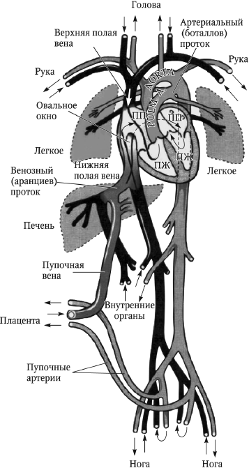 Рис. 16. Кровообращение плода (схема) (по: Hanretty K. P., 2003):