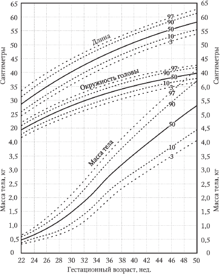 Центильные величины массы, длины тела и окружности головы плода в зависимости от срока гестации представлены на рис. 19.