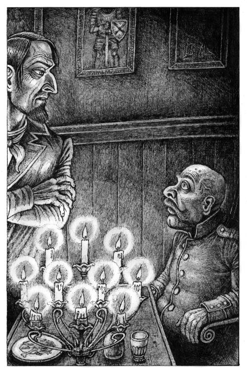 Он сидел в небольшом кружке яркого света, который играл на его серебряных эполетах и освещал его терракотовое лицо, густые брови и рыжие усы. Вне этого светлого круга царили тени и мрак, и предметы, наполнявшие столовую, различались с трудом.