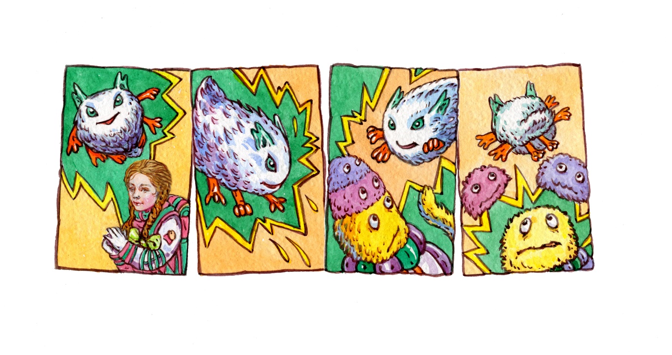 Лисана не успела договорить, потому что Плюпс перескочил с плеча на стену, пробежал по ней вверх и спрыгнул прямо на голову Взюка. Тот дико взвизгнул и отчаянно замахал щупальцами. Вдруг его разноцветная голова развалилась на три части. Жёлтая осталась на месте, а розовая и сиреневая упали в траву, бешено подпрыгивая.