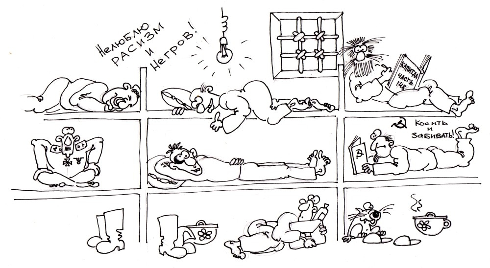 В нашем бараке, кроме Геббельса, собрались нормальные пацаны. Хой, как смотрящий, падлянок не допускал. «Цветных» извел как клопов и администрация не могла доебаться до нас по-серьёзному. Поэтому давила работой. Но это лучше, чем курвиться и «стучать» на ближнего, как поганых бараках с политиками и чиновниками.