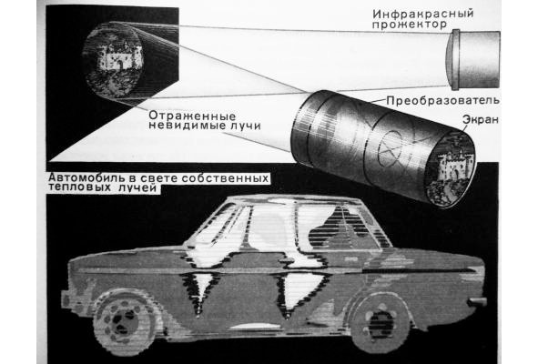 Если на корабле установить приборы, превращающие невидимые лучи в видимые, то корабли смогут «говорить» с берегом на бесшумном и незаметном языке инфракрасных лучей, и в этот разговор не смогут вмешаться посторонние. В приборах-преобразователях видимые лучи попадают на фоточувствительный слой, выбивают из него электроны, электроны летят к экрану, покрытому слоем люминофора, и заставляют его светиться… Точно так же устроена лучевая охрана и сигнализация офисов и банков в ночное время; если нарушитель пересечёт невидимый луч в помещении, то электрический сигнал от прибора-преобразователя мгновенно включит сигнал тревоги. + Лампы невидимого света и устройства, обнаруживающие присутствие невидимых лучей широко используются во всех армиях мира… Бронированные машины оборудованы зеленоватыми экранами, похожими на экран телевизора, расположенными перед глазами водителя. На экране отчётливо, как днём, видна идущая перед нами машина, дорога, лес… На зеленоватом экране видны изображения всех предметов в отраженном свете сильного потока невидимых инфракрасных лучей, посылаемых прожекторами и фарами на бронемашинах. Однако «противник» может обнаружить нашу бронемашину с помощью датчиков инфракрасных лучей, поэтому на боевом рубеже прожектора и фары отключаются и вместо них включаются приборы теплового видения, которые превращают в видимый свет то слабое инфракрасное излучение, которое испускают немного нагретые танки и орудия «противника». Их силуэты явственно проступают на тёмно-сером экране, несмотря на разделяющее нас расстояние в несколько сотен метров. Тепловизор – прибор, улавливающий тепловое излучение на расстоянии, а также распознающий его «обладателя».