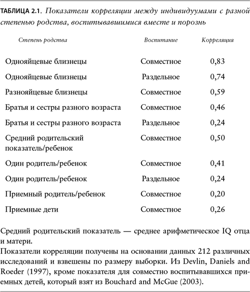 Как же «наследственники» приходят к таким выводам? Взгляните на таблицу 2.1, где собраны данные многочисленных исследований, сравнивающих людей, состоящих в родстве, которые росли либо вместе, либо порознь. Непосредственная оценка наследуемости представлена показателями для однояйцевых близнецов – имеющих идентичный генотип, – которые росли отдельно друг от друга. Она равна 0,74 – и именно на нее опирался Артур Дженсен в своих выводах относительно генетической природы IQ. Поскольку условия воспитания близнецов в данном случае разные, то по логике сходство между ними может быть обусловлено только генетикой (а также пренатальными и перинатальными факторами, которые могли оказывать влияние на близнецов еще до их разделения, однако большинство «наследственников» считает, что этим фактором можно пренебречь).