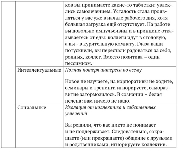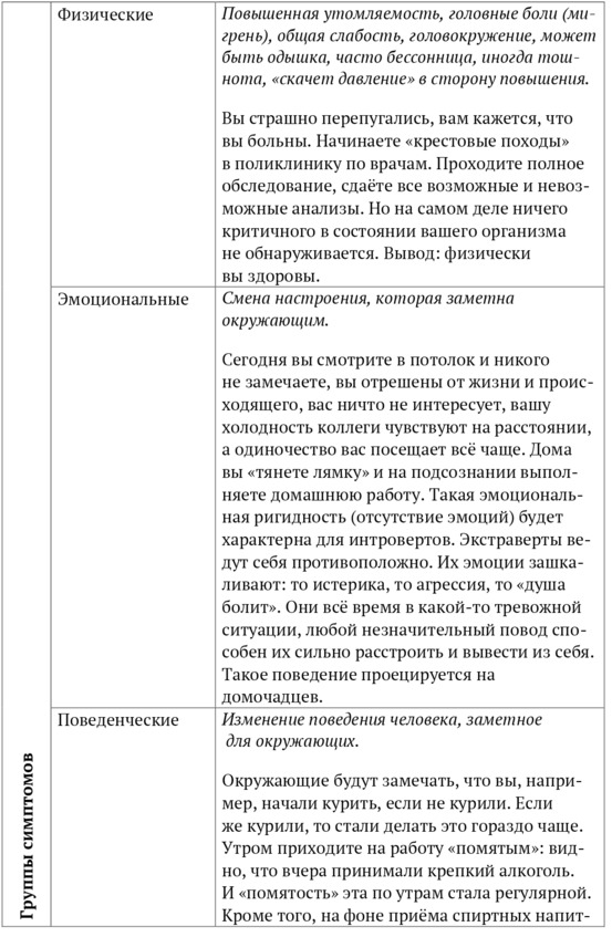 Как у любой другой болезни, у выгорания есть свои признаки или (опять воспользуемся медицинской терминологией) симптомы. Их систематизация с описанием приведена в таблице ниже: