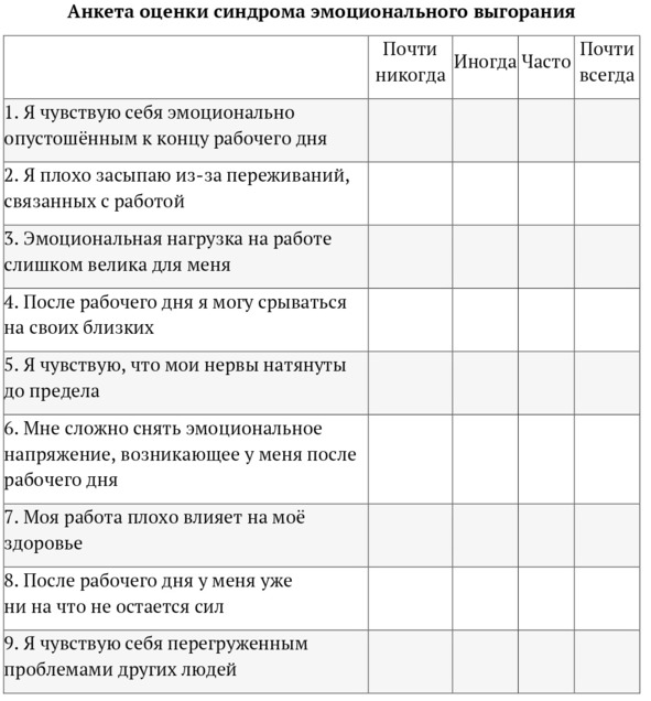 Вывод прост: эмоциональное выгорание может затрагивать все стороны вашей жизни. Как правило, его симптомы проявляются в комплексе. Понаблюдайте за собой, проанализируйте признаки. Прямо сейчас возьмите в руки карандаш и заполните анкету. С её помощью вы сможете определить степень своего эмоционального выгорания. Если его у вас нет, то я вас от всей души поздравляю! Вы можете отложить в сторону данную книгу. А если всё же вы горите, тогда читаем дальше…
