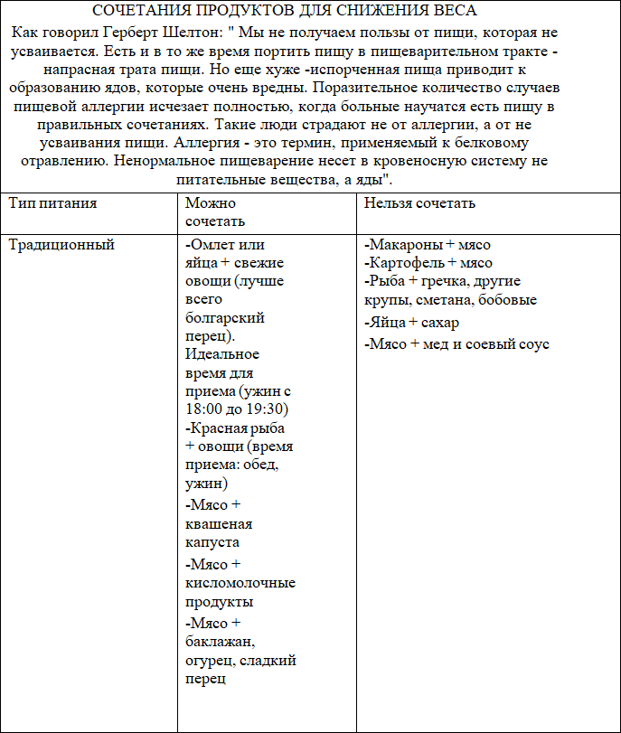 Сочетание продуктов еще одна составляющая грамотного и «правильного» снижения веса. Сочетая продукты правильно, мы обеспечиваем нашему организму слаженную работу. Продукты, тем самым, лучше усваиваются в организме, не вызывая процессов гноения, брожения и вздутия. Например, нельзя сочетать помидор+огурец, так как один имеет кислую среду, другой щелочную. В организме такое сочетание образует процессы брожения, что останавливает снижение веса. Или, например, нельзя сочетать мясо+ картофель или макароны.