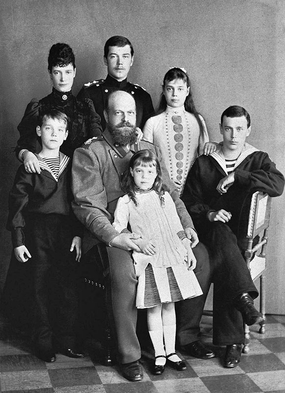 Фотография Александра III, Императора России (1845–94) и его супруги Марии Федоровны, Императрицы России (1847–1928) с детьми Цесаревичем Николаем (1868–1918), позднее Николаем II, великим князем Георгием Александровичем (1871–99) ), Великая княгиня Ксения Александровна (1875-1960), великий князь Михаил Александрович (1878-19??) и великая княгиня Ольга Александровна (1882-1960). Александр III сидит в центре, а великая княгиня Ольга стоит перед ним. Мария Федоровна стоит позади него слева, ее левая рука лежит на его плече, а правая рука обнимает великого князя Михаила. Николай Цесаревич и великая княгиня Ксения стоят справа от матери. Великий князь Георгий сидит в крайнем правом положении, скрестив ноги, а левая рука лежит на спинке стула. Александр III был императором России с 1881 по 1894 год. Будущий Николай II, его старший сын, должен был стать последним монархом России.